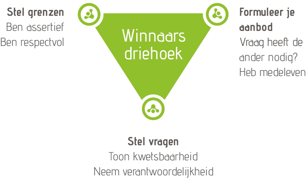 De Winnaarsdriehoek is de reactief tegenhanger van de Dramadriehoek. De Winnaars driehoek legt uit hoe je een dramadriehoek kunt omzetten in iets positiefs. Hoe je een win-win situatie kunt creëren uit een conflict. Een winnaarsdriehoek heeft drie positieve rollen: grenzen stellen, aanbod creëren, vragen stellen.
